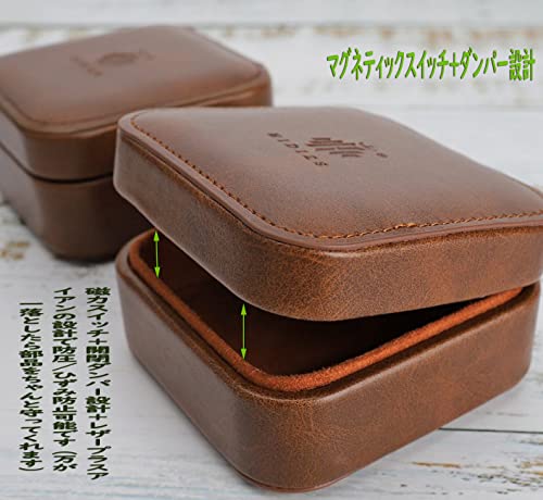 指輪ケースを思わせるスクエアなデザインに落ち着いたレザーの色合いが、高級感があり大人な雰囲気を演出します。