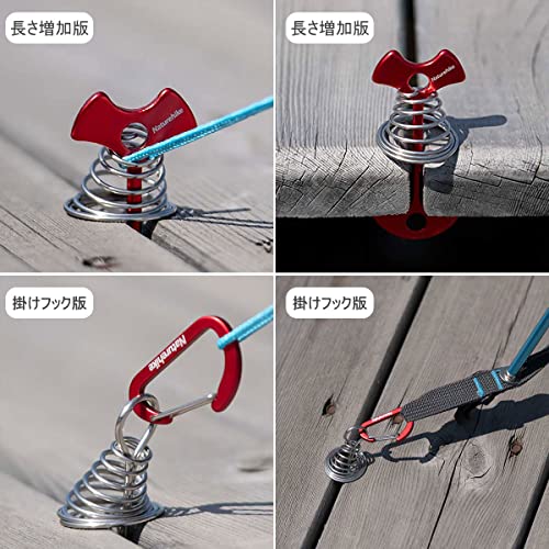 ウッドデッキペグは、本体のアンカーペグ、スプリング、カラビナの3パーツから成り立っているものが多く、見た目が魚の骨のように見えるため、通称「魚骨ペグ」とも呼ばれます。